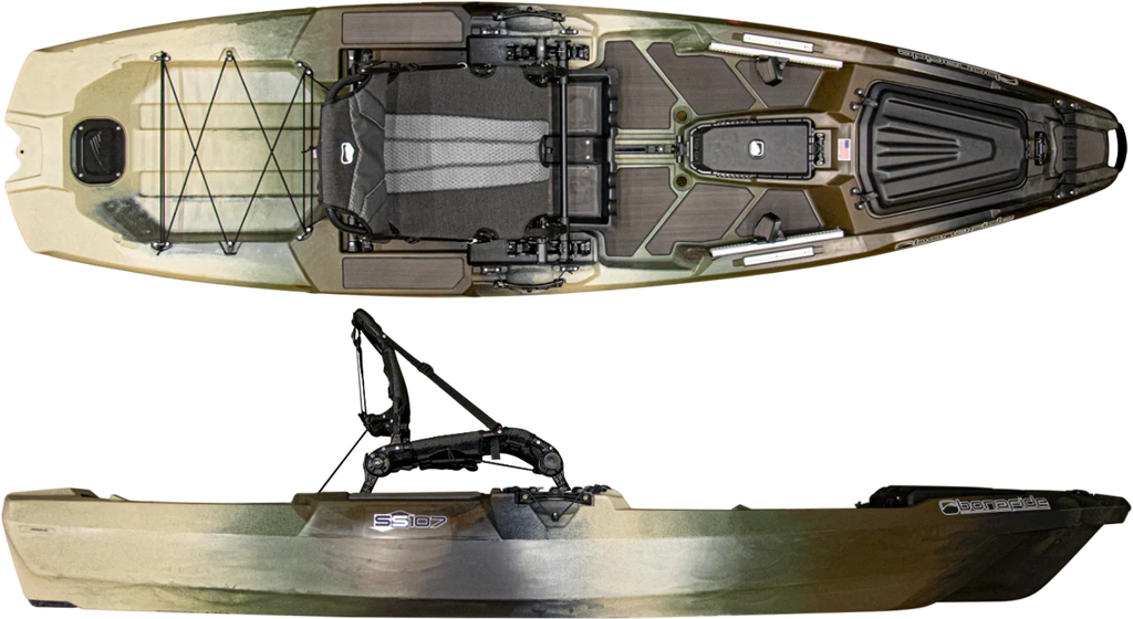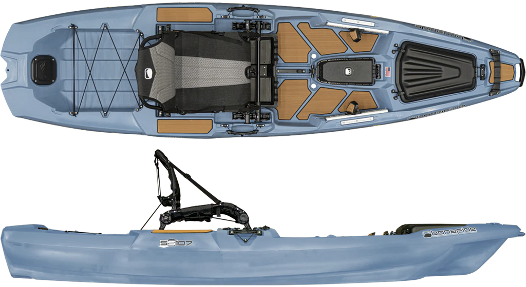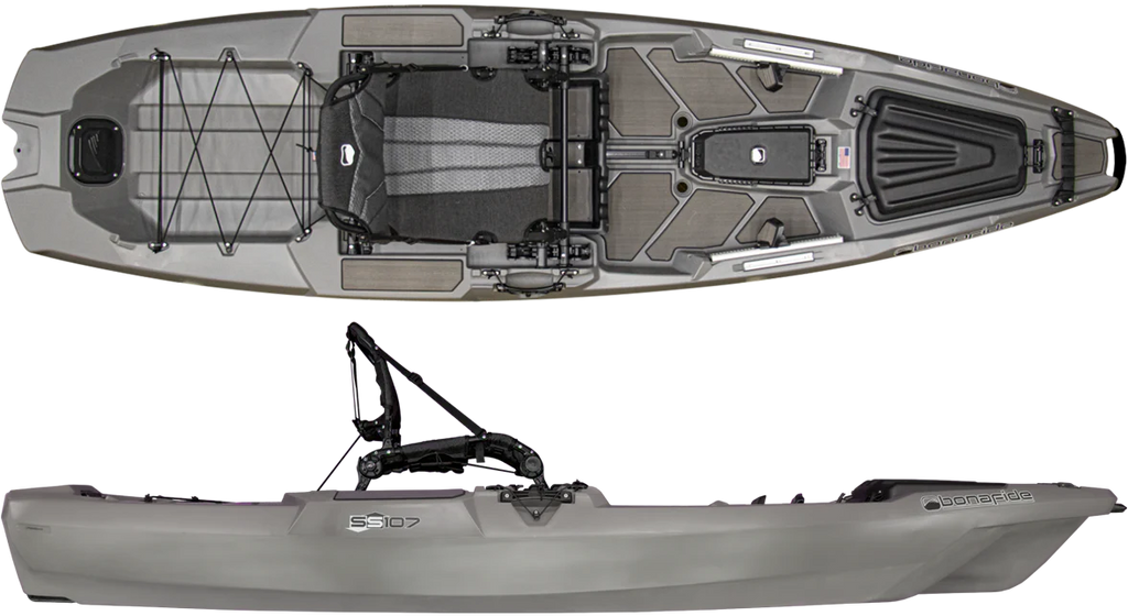 Start your day on the water with the Bonafide SS107, engineered for anglers who demand performance and versatility. The HiRise™ seating system delivers exceptional comfort with an ultra-high seat that reduces lower back strain, while the convertible SeatRack™ lets you drop lower for serious paddling when distance matters. At 10 feet with a 34-inch beam, this kayak defies expectations—it's remarkably stable yet tracks and glides like a boat twice its size. What truly sets the SS107 apart is its Ultimate Fishability™: YakAttack GearTrac keeps your tackle organized and accessible, while the thoughtful design lets you move freely, stand confidently, and fish all day without compromise. Every detail works in harmony, from ergonomics to gear placement, creating a kayak that performs as hard as you do. Experience the difference at your local Bonafide dealer with a demo paddle. Note: SkyHooks not included on stock SS Series models.